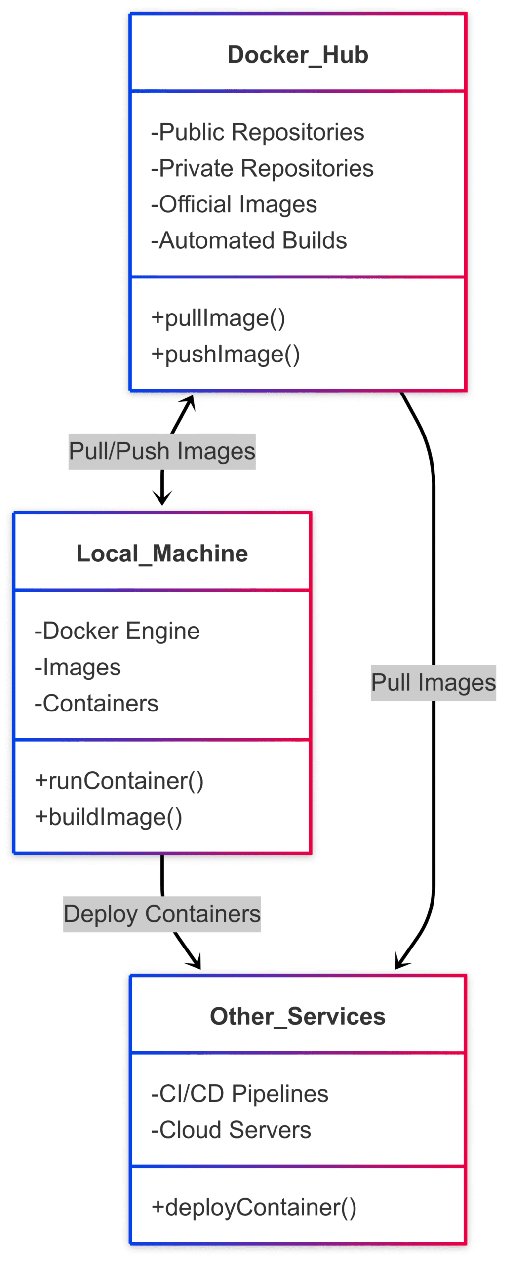 Here’s a diagram (Docker Hub Ecosystem) to tie it all together, showing how Docker Hub interacts with your local machine and other services.